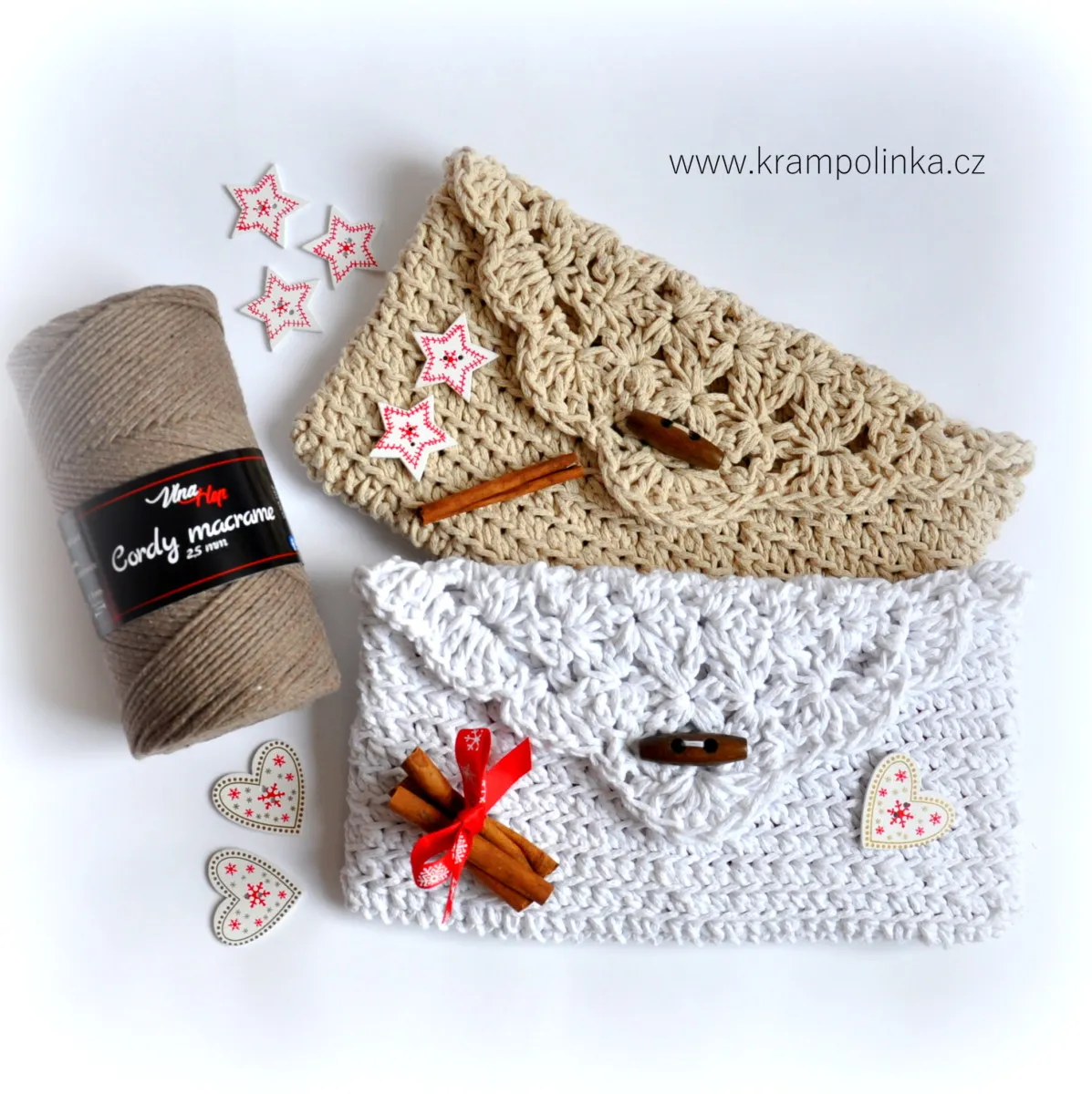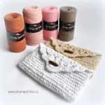 Your recipient will feel that you truly put thought and care into their gift, and you’ll enjoy the satisfaction of giving something beautifully wrapped and handmade. Today, we’ll make a crocheted envelope together. For the envelope, I used the new Vlna-Hep Cordy Macrame – a 2.5 mm cord made from recycled cotton. One 250 g skein contains 180 meters. You can watch the unboxing of this yarn here, or check out these two specific colors from www.mojegalanterka.cz.