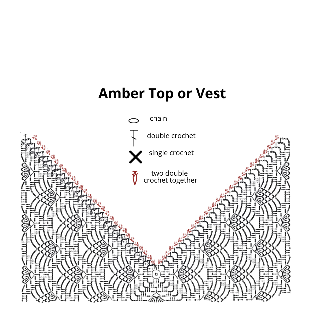 We crochet the Amber top or vest from two identical panels. After joining them together, we adjust the desired length and continue adding as many rows as needed to reach the top or vest length we want. Each panel is worked from the center, crocheting back and forth on three sides. The fourth side of the square, which remains unworked, creates the neckline. Once we reach the required armhole height, we continue working only on the width of the top, gradually adding stitches under the arms.