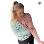 Row 1: Cross the front panels over each other by 3–4 filet squares. Try it on to check the overlap and secure with stitch markers. Attach the yarn at the side seam, chain 1, and continue with BLO SC. At the crossing, crochet BLO SC through both layers together. End the row with a slip stitch (SL ST).