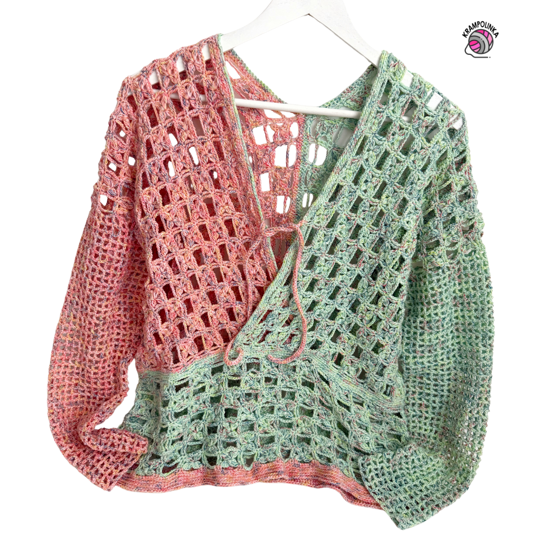 We’ll crochet using five-strand gradient yarn BB Cake from the e-shop Pohoda na háčku. I used two cakes – Apricot Sorbet and Pistachio Temptation, each with 800 meters of yarn. I used up the entire green cake and about two-thirds of the apricot one, which means roughly 1400 meters of 5-ply yarn for size 42-44. If you prefer a single-color version, simply get one larger cake or two of the same color.