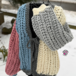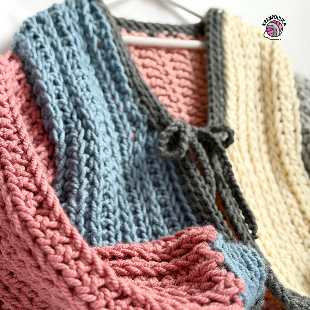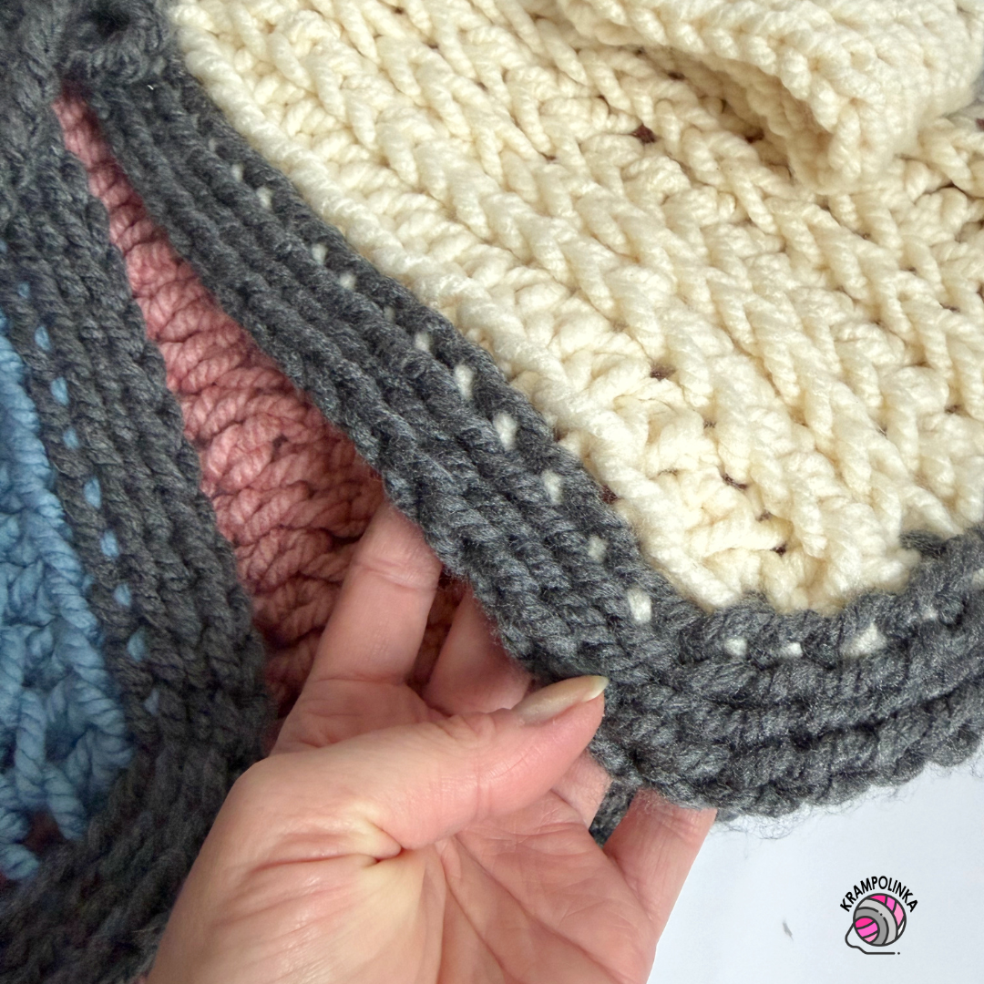 The stitch pattern used is easy yet effective. On the wrong side, we work half double crochets into the front bottom loop; on the right side, we work half double crochets into the third loop. The resulting texture resembles knitted fabric. For the edging, I used single crochet in a herringbone-style pattern.
