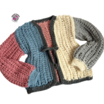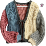 The sweater construction is very simple. We crochet flat, working back and forth: one back panel, two shaped front panels, and two rectangles for the sleeves. The individual pieces are then crocheted together, the entire sweater is finished with edging, and the project is complete.