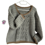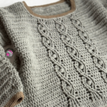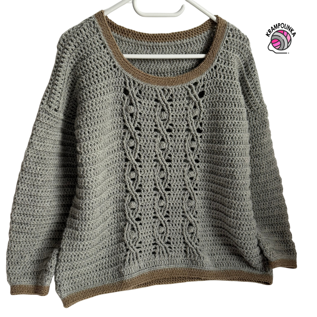As for the crocheting itself, we start with a foundation chain and work row by row back and forth. The front panel features the cable stitch pattern, while the back panel is worked without a pattern. The cable stitch pattern is worked over 35 stitches, arranged as follows: 9 stitches for the first cable, 4 stitches of the pattern in between, 9 stitches for the second cable, 4 stitches of the pattern in between, and 9 stitches for the third cable. The cable pattern is repeated over 6 rows. The foundation chain requires an odd number of stitches. Once both the front and back panels are finished, we join them at the shoulders and underarms, then crochet the sleeves and finish by edging the entire sweater.