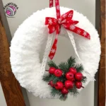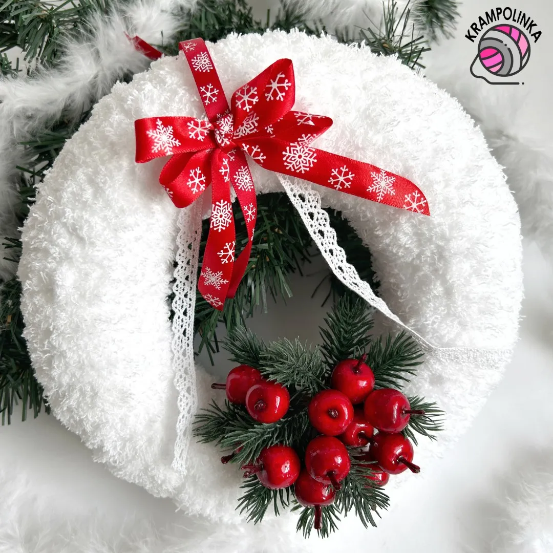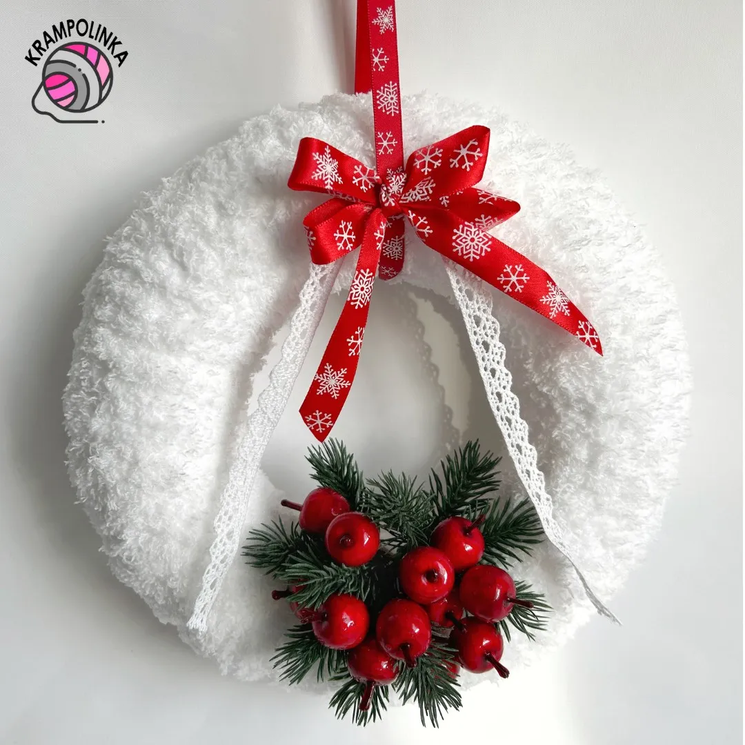 - Soft white Vlnika Daja yarn carefully wrapped around the wreath base to create a fluffy texture.