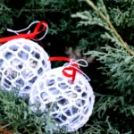 Round 8: 4 CH, SC under the next arch, repeat around. The last arch: 2 CH, insert hook into the first CH of the round and make 1 HDC. End in the center of an arch and insert the bauble.