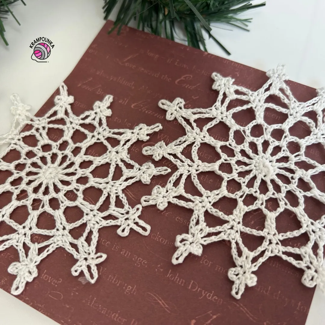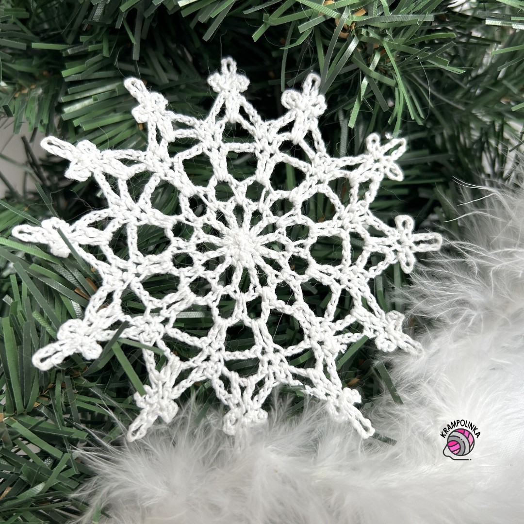 This snowflake is easy enough even for beginners. We crochet in the round with a 2 mm hook. Once the snowflake is finished, it only needs to be starched. For starching, I use slightly diluted Alba Efekt starch, a polystyrene board wrapped in plastic food wrap, and injection-needle pins for blocking — they do not rust.