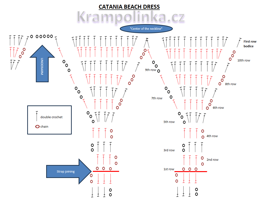 Note: The edge of the bodice must end below the bust. Adjust the length according to your own circumference and bust by adding or subtracting rows from the bodice.