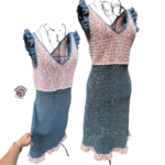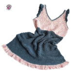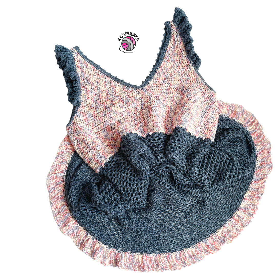 Regarding size adjustment, this pattern is very flexible. More rows in the bodice triangles or more stitches in the triangle will result in a wider circumference. If you crochet fewer rows in the triangle, you will get a size suitable for girls and children. The dress can be made in crop top, top, or tunic length, depending on how much yarn you have.