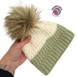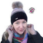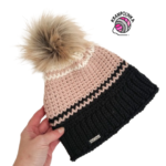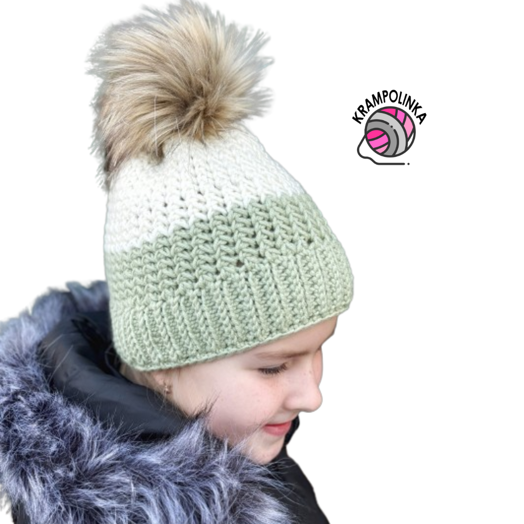 For the pattern, I used the herringbone single crochet for the brim. Definitely check out the video to create a ribbed pattern. Next, we crochet the V-stitches, i.e., always crochet two single crochet together and make a chain space. We crochet the next rows UNDER the chain spaces. Again, I recommend watching the video for where to place the hook. It’s more laborious, but the pattern is denser and looks better. When crocheting the first row of V-stitches, we need to expand it several times. Without expanding, the hat would be too narrow. After the first expansion, we no longer expand in the pattern and crochet to the required height of the hat. In the last row, we switch hooks and omit the chain spaces in the pattern. Finally, we tighten the top of the hat with a needle and yarn. Don’t forget to save the ribbing color for its edging. We finish the hat with an 18 cm diameter pompom.