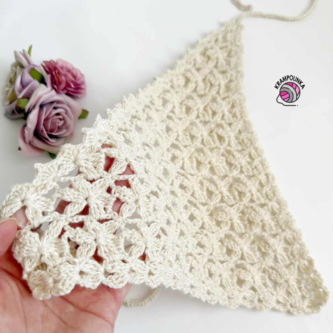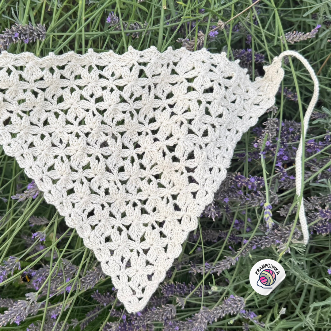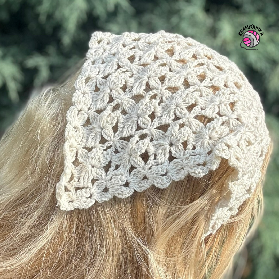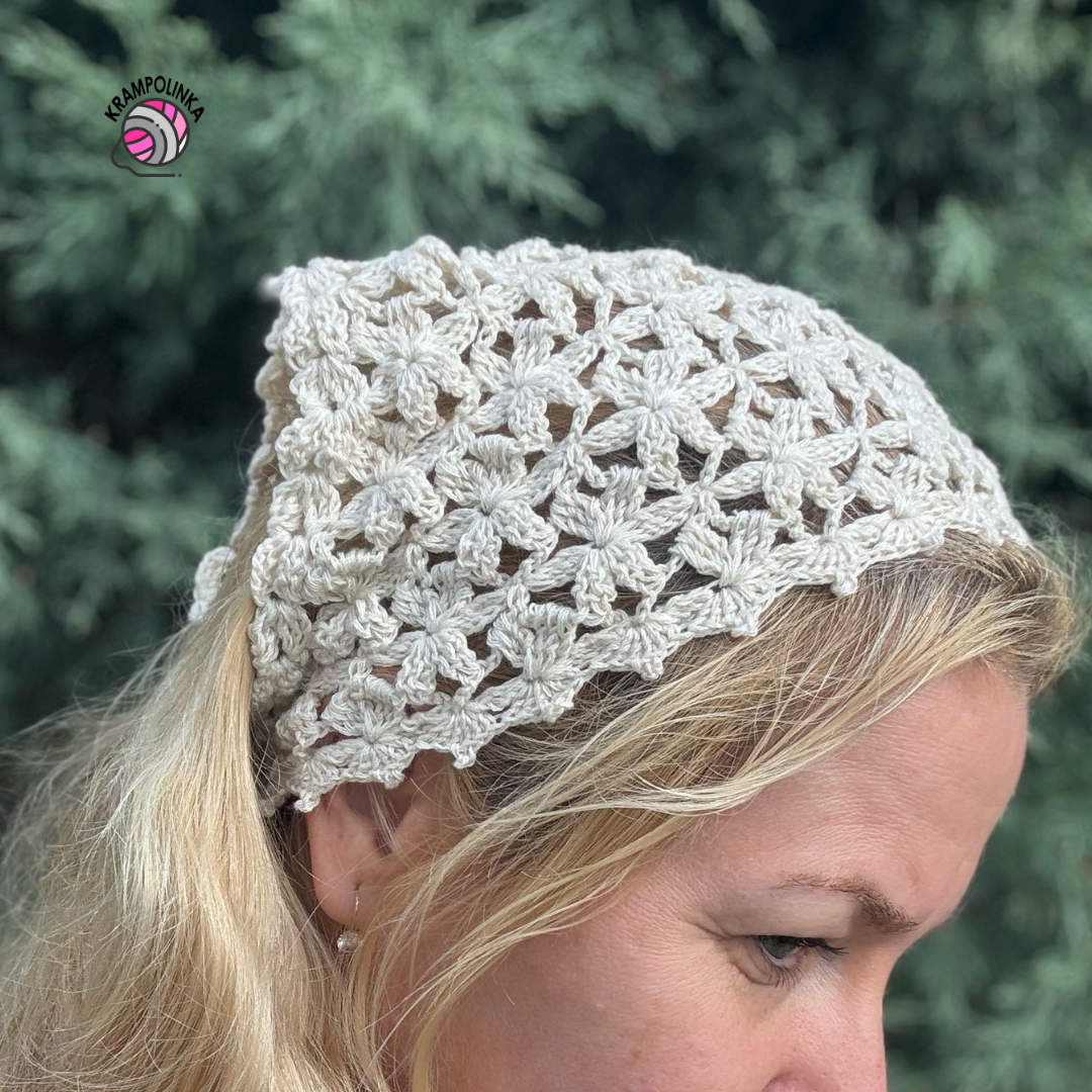 The idea for this headscarf came to me on a warm summer day. I was inspired by the classic Czech fairytale The Madly Sad Princess, where Helena Vondráčková wears a fabric headscarf tied in her hair – a simple yet elegant accessory. I wanted to translate that same grace and charm into a crocheted version.