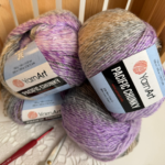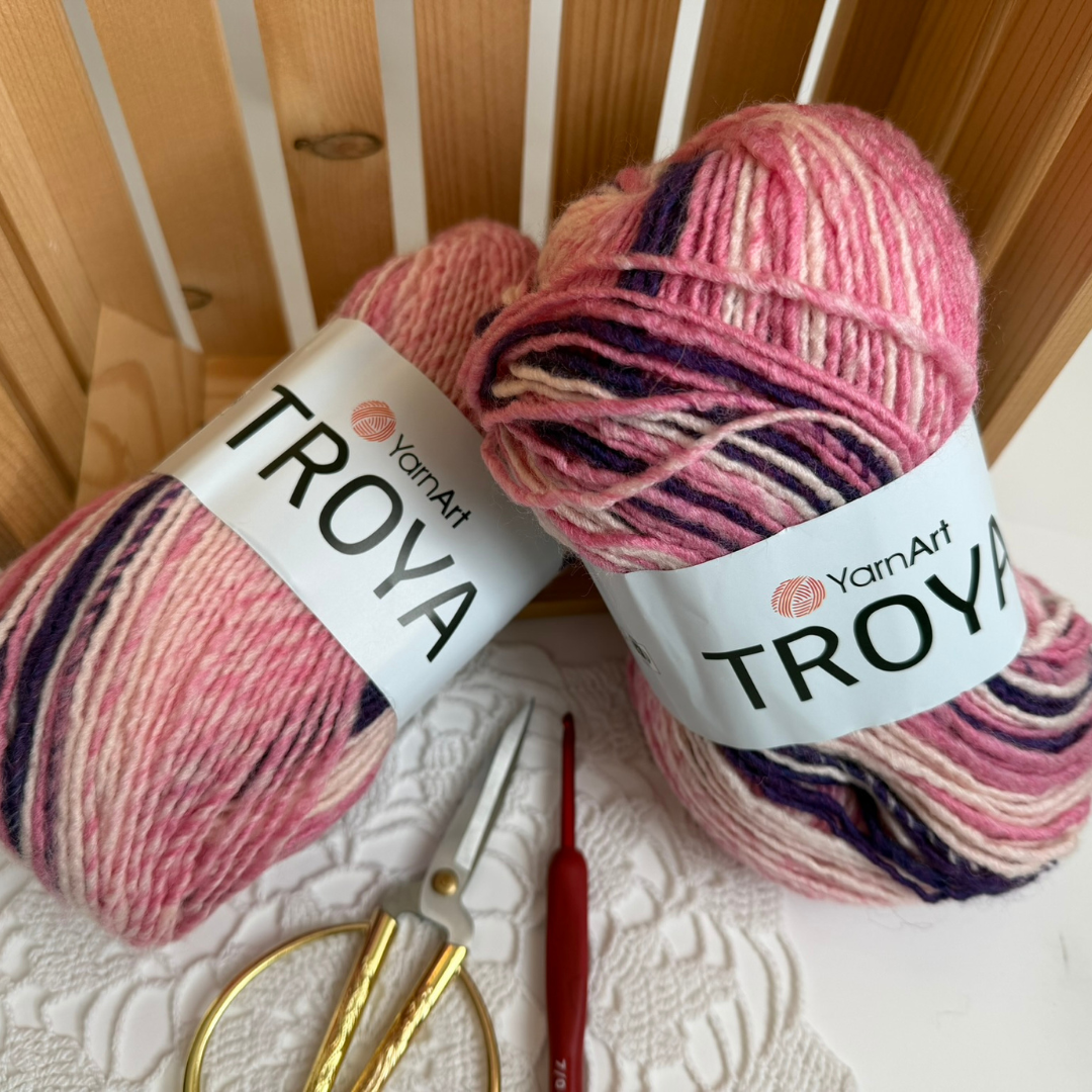 • YarnArt Troya A wool and acrylic blend with a yardage of 100 g / 250 m. A versatile yarn that works beautifully for spring sweaters, blankets, or ponchos. It’s pleasant to work with and creates a nicely structured fabric.
