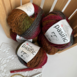 • YarnArt Pacific A wool and acrylic blend in a smaller skein, 50 g / 200 m, with a yardage similar to gradient cakes. It’s wonderfully warm yet perfect for lace patterns. Ideal for lightweight sweaters, vests, and circular projects.