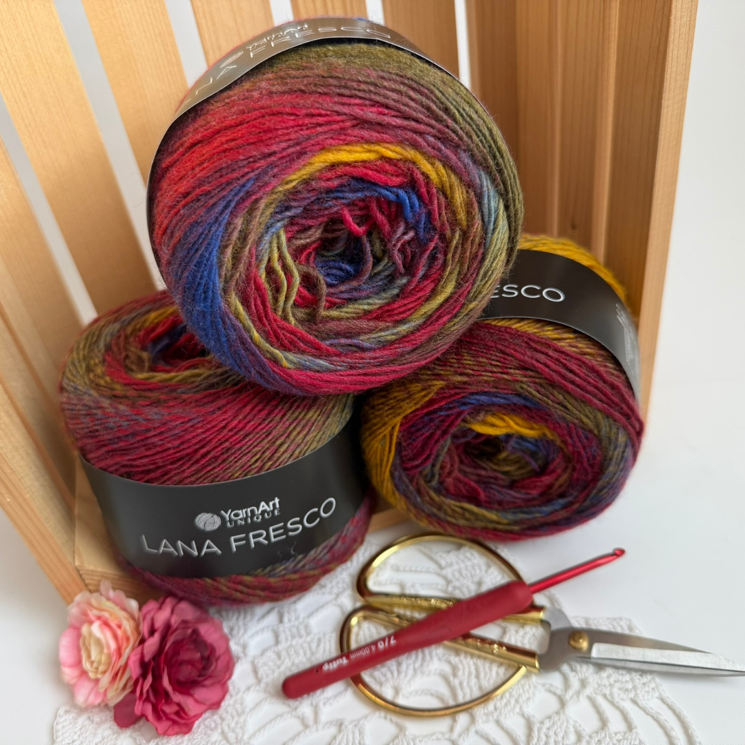 YarnArt Lana Fresco 100% wool, with 380 m per 100 g skein. Perfect for spring projects, lace shawls, and lightweight blankets. It features a beautiful tweed-like effect with smooth color transitions. Lana Fresco is available in packs of four skeins. You might also like the shawl we featured in Ona Ví magazine, made from this yarn.