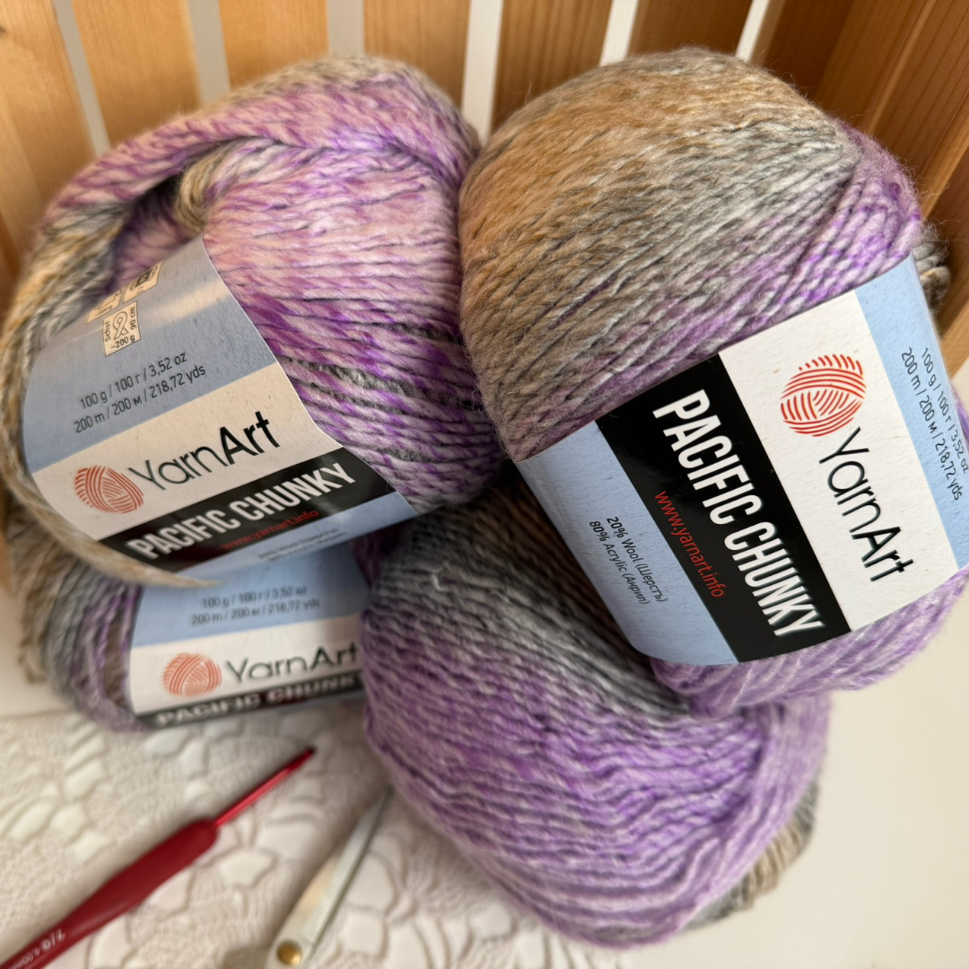 • YarnArt Pacific Chunky A thicker version of Pacific with a yardage of 100 g / 200 m. A great choice for hats, scarves, cowls, gloves, blankets, and warmer sweaters. It really shines in textured stitch patterns.
