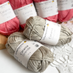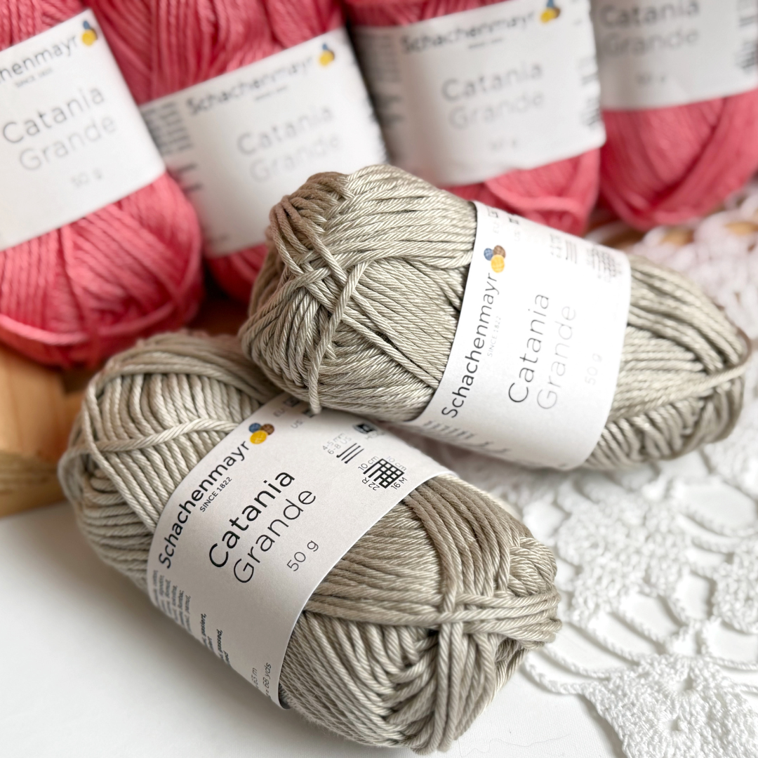 Schachenmayr Catania Grande has a yardage of 50 g / 63 m and is made from 100% Egyptian cotton. It is available in 17 beautiful shades. Compared to the classic Catania (or Catania Color), which has 50 g / 125 m, the Grande version is approximately twice as thick. This means faster progress and a more pronounced stitch definition. You can purchase Catania Grande here.