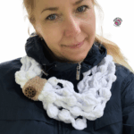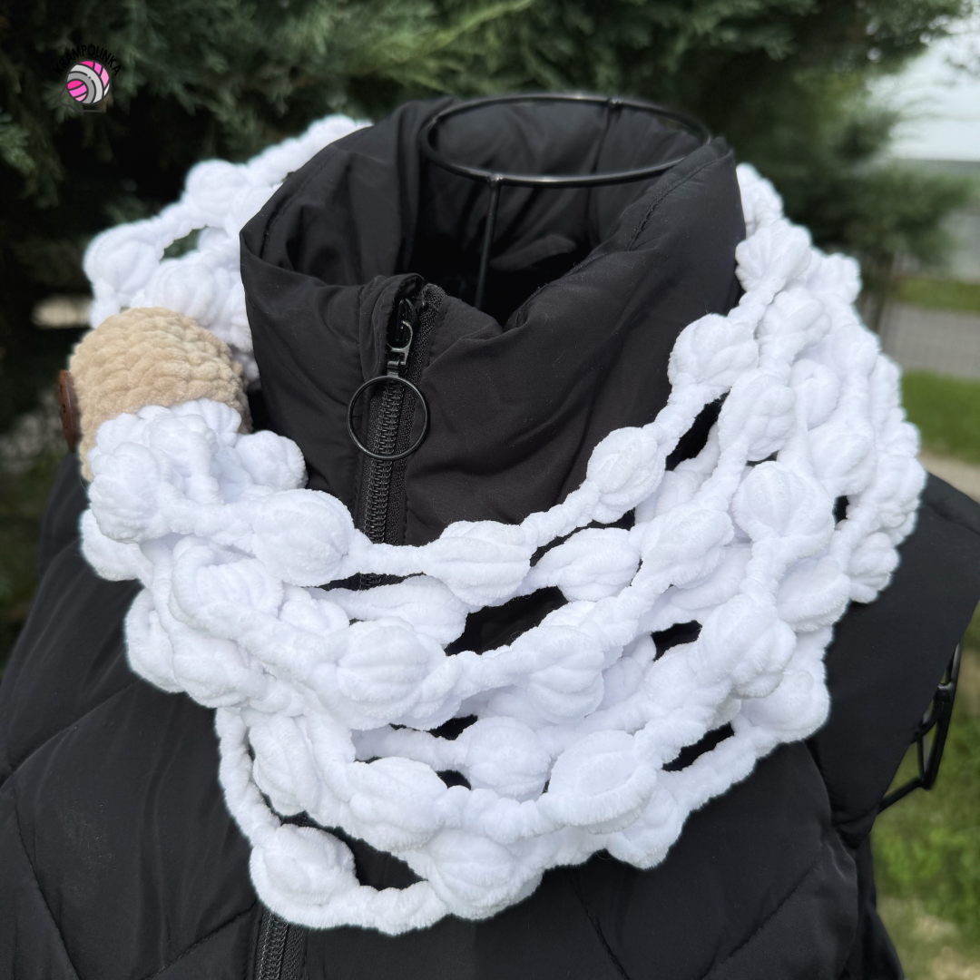 This time, we’ll crochet a very quick and original cowl using chenille yarn. Even a complete beginner can handle this project. You’ll be working with a chain and puff (bubble) stitches made from yarn overs. Crochet one long chain, then wrap it around your neck to set the desired size of your cowl. Count the number of bubbles, and from that point, always measure and attach the chain at the same spot. This creates a multi-layered bubble cowl. Unravel any extra bubbles at the end. The opposite ends of the chain are not joined together.