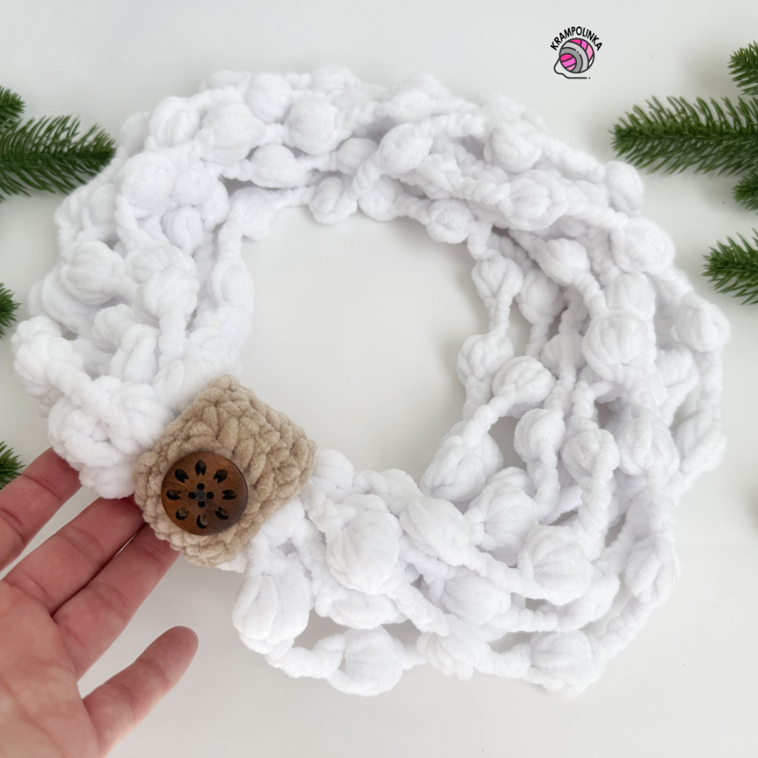In the second step, crochet a chenille strip that will wrap around and hold all the layers of the cowl together in one place. Sew it on. Thanks to the bubble structure and tightening, the cowl will keep a uniform size. Decorate the strip with a wooden button, if you like. The first and last two bubbles should remain beyond the tightening point.