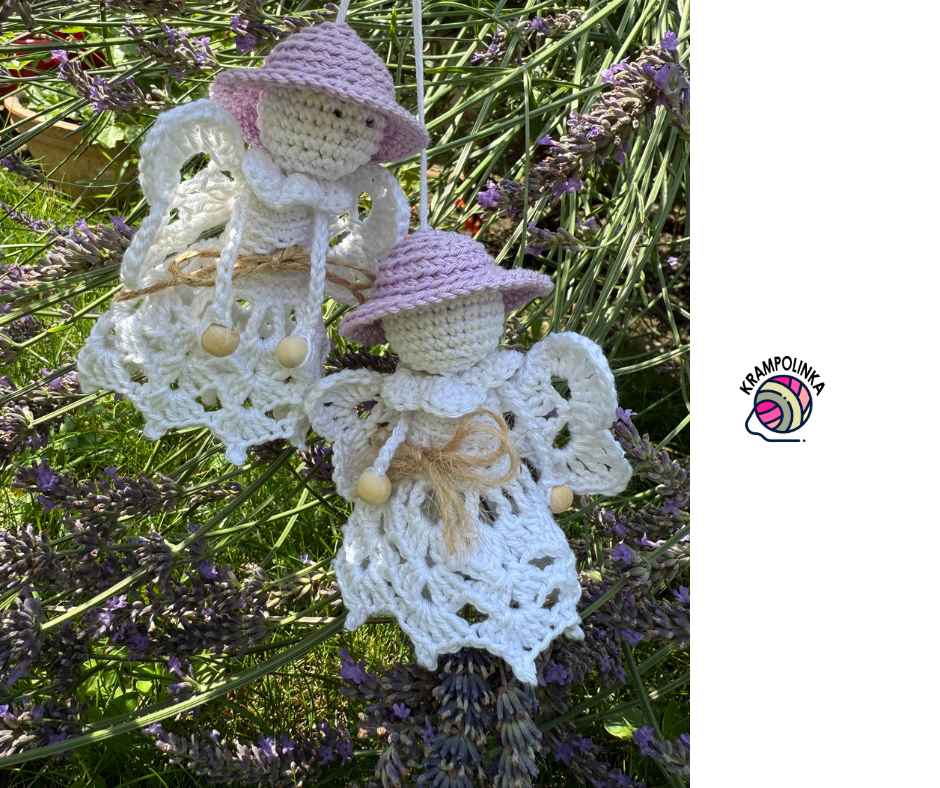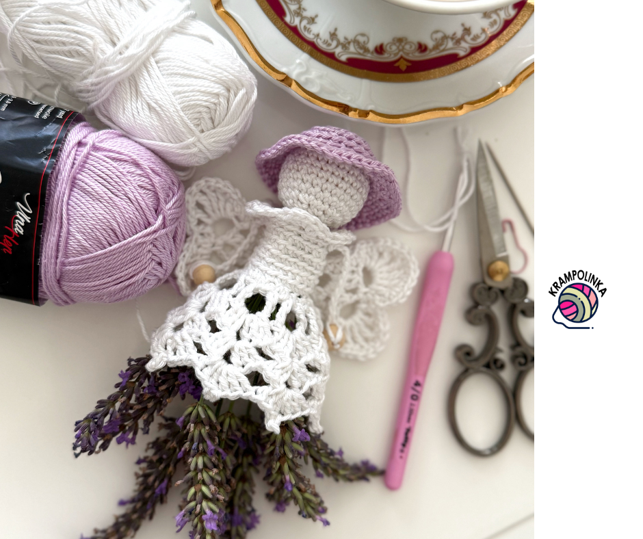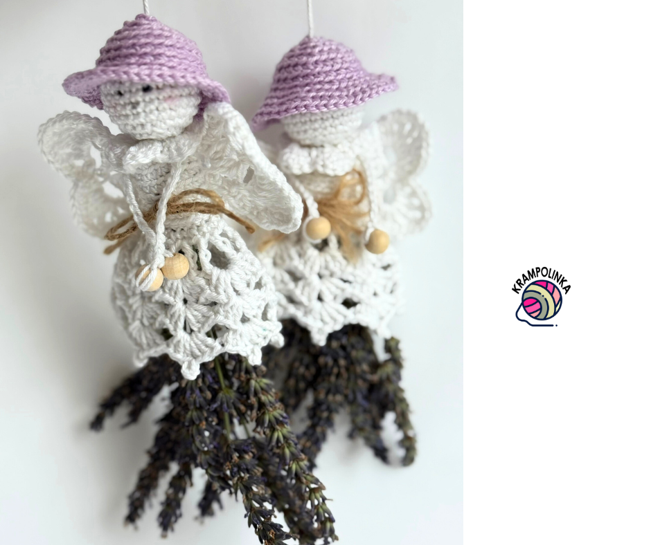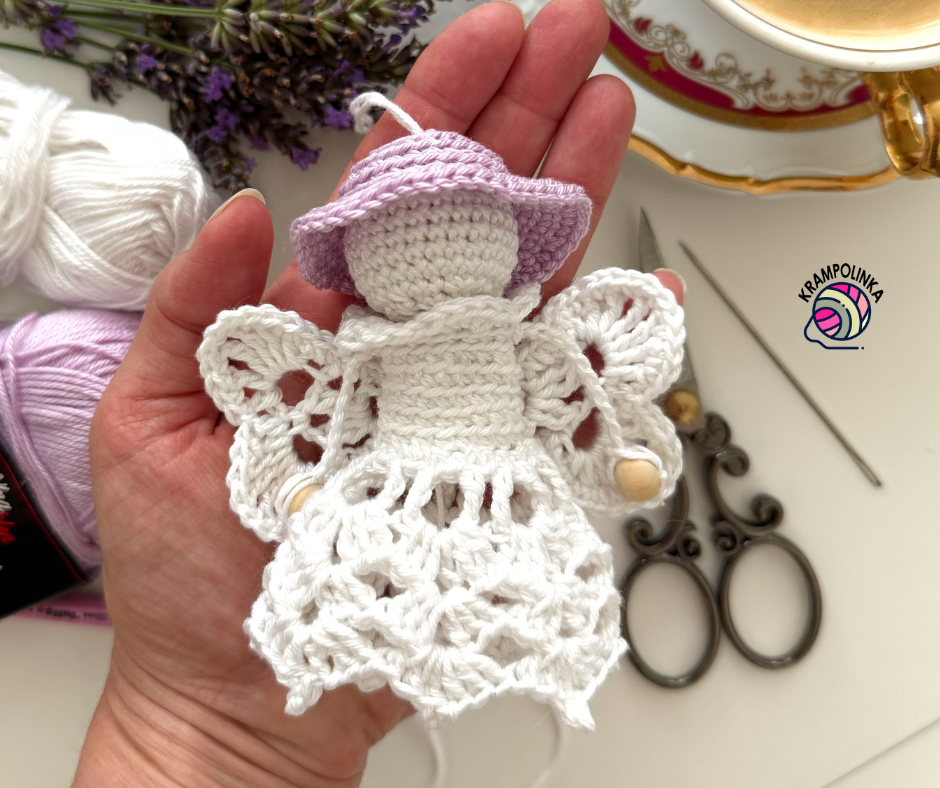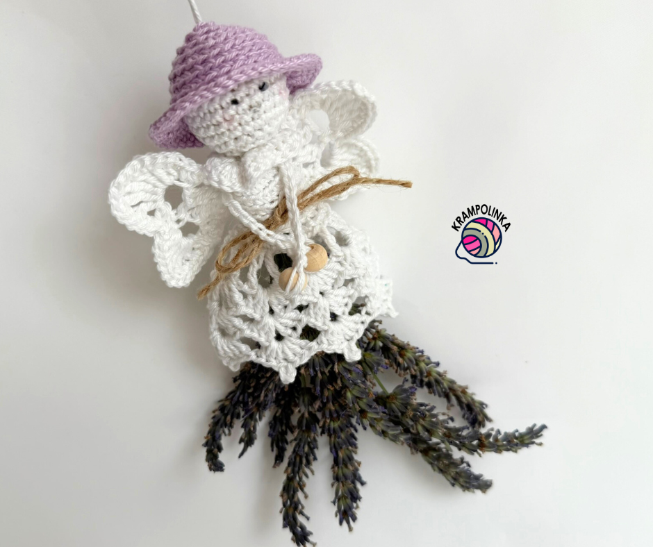 The fairy’s head is made by covering a wooden bead with a circumference of 9 cm. Her body features a fine collar and a lacy skirt, perfect for tucking in sprigs of lavender. Her hands end in tiny wooden beads, and on her back she wears crocheted wings shaped like hearts. The lavender sprigs are tied to her body with a jute string bow. The entire look is finished with a stylish lilac hat, perfectly matching the lavender hues.