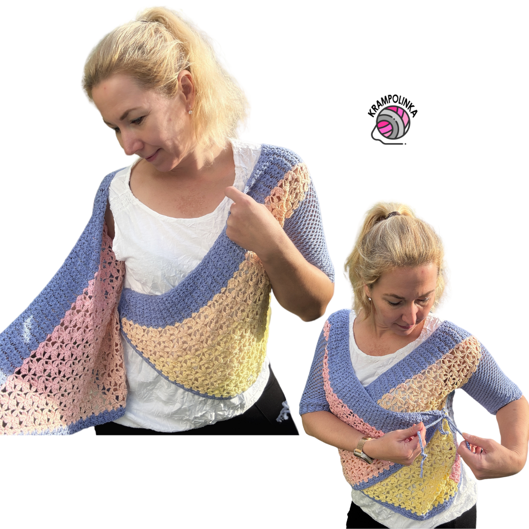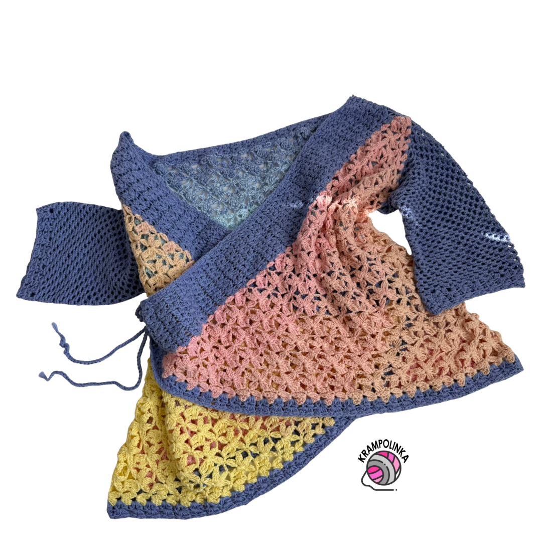 From the cotton gradient yarn ball available at the Klubka od Lary e-shop, I created a crocheted wrap cardigan with short sleeves during the summer season. Thanks to its versatile design, it can also be worn as a blouse. A timeless piece you’ll reach for all year round, especially from spring through early autumn.