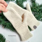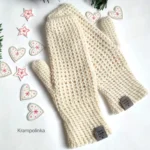 Then we continue crocheting the required length of the mitten to the length of the palm. When transitioning to the wrist, we switch from half double crochet V stitches to single crochet V stitches, which helps to nicely shape the mitten. Since single crochet V stitches tighten the fabric, use a hook half a size larger for the ribbed cuff.
