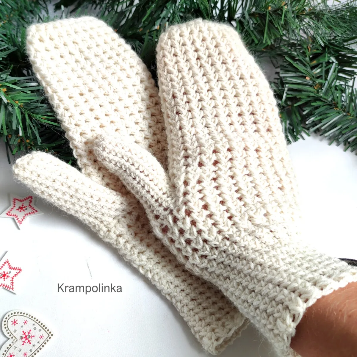 The mitten is crocheted from a foundation chain. Start the chain as long as the width of three fingers placed next to each other. Mitten is worked in continuous rounds without closing the rounds. For the chain around the thumb, I recommend using a stretchy chain. Adjust the length of the stretchy chain depending on how many stitches you need to add to widen the palm. At the wrist, continue with the pattern but switch to single crochet V-stitches. The number of cuff rows depends on the desired mitten length. In the last round, crochet double single crochet V-stitches (see video).